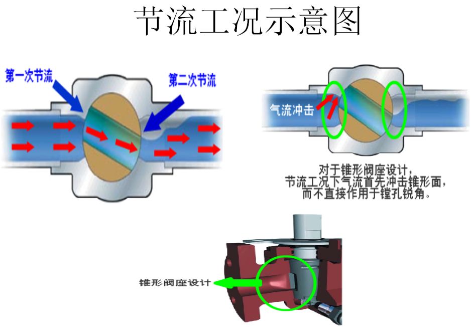 對于錐形閥座設計的旋塞閥,節流工況下氣體流入閥芯時,氣流首先沖擊它前面錐形閥座的錐面,通過錐面的導向作用該表方向后進入閥芯,而不是直接沖擊閥芯鏜孔的銳角,加之閥芯可以根據節流工況設計多樣的流動面、形狀和功能所以旋塞閥可以用于節流工況。